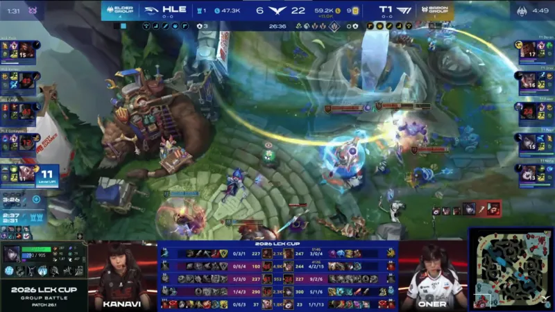 比赛第22分钟,T1抓掉Zeus纳尔后拿下大龙,随后中路打出0换4大胜HLE→